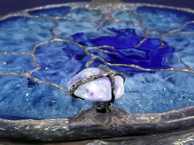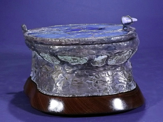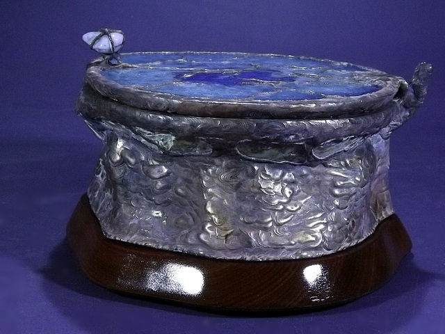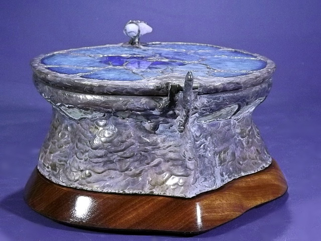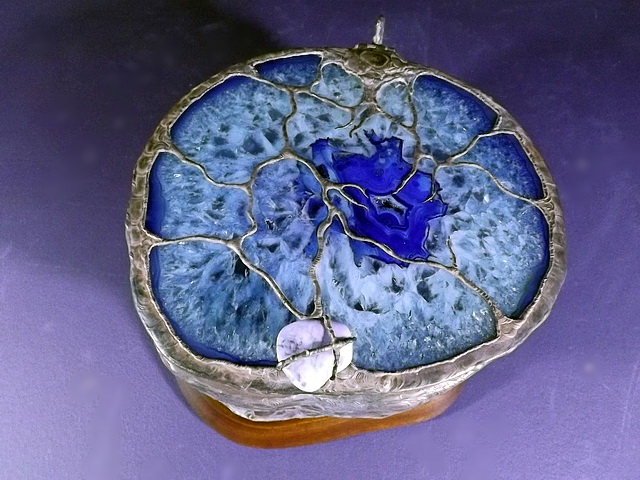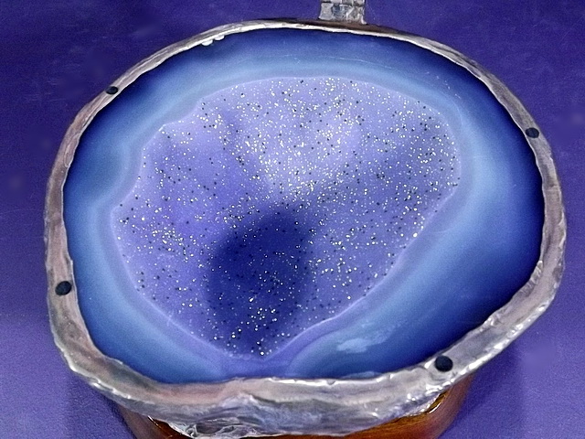 Another beautiful Brazilian Geode shows off its Druzy interior, with its black inclusions. I cut, and fit a slice of Brazilian Agate for the lid, added a Turquoise nugget for the handle, and a hand cut and finished slice of a hardwood, Corymbia Opaca, or “Bloodwood”, for the base. The bottom is covered with felt to protect furniture.