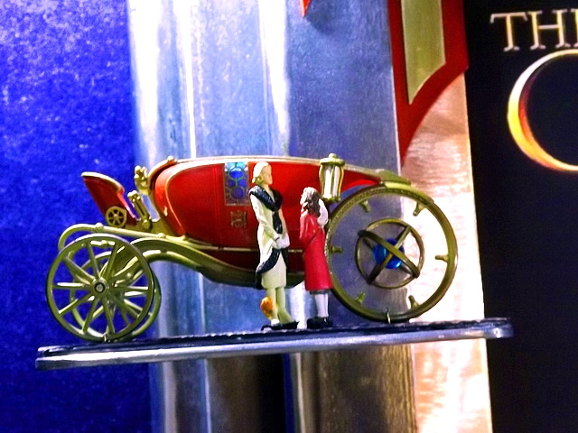 The main frame is cut, welded and ground mild steel angle, flat, round and square stock, with brass and copper elements. The matte is copper. The Central “M” at the top center is for the all powerful Magisterium which controls most of Lyra’s world. I hand cut the pieces from sheet copper and brass. At the left side of the frame is a replica of Mrs. Coulter’s “Anbaric Carriage”, by Corgi, with Mrs. Coulter and Lyra getting ready to board along with their daemons. On the right side of the frame is a replica of a “Magisterium Sky Ferry”, also by Corgi, used as a more comfortable form of transportation by Mrs. Coulter. The inset , behind the Sky Ferry, is an image of Lyra’s world seen as they pass over it.