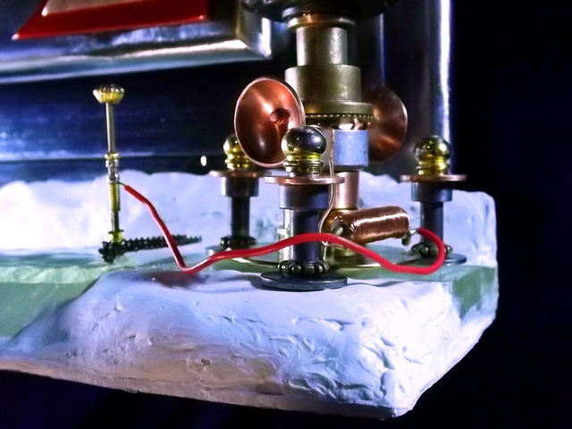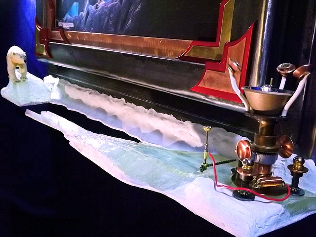 For the “ice” I’ve used sections of Selenite which has a very nice ice look and texture. I made the Intercision Machine from many brass and copper parts. I spent almost as much time on this little object as I did on the main frame. This frame weighs approximately 40 lbs.