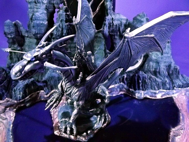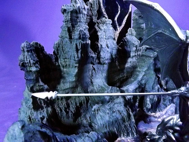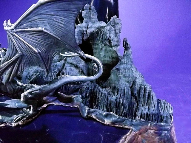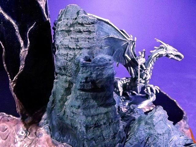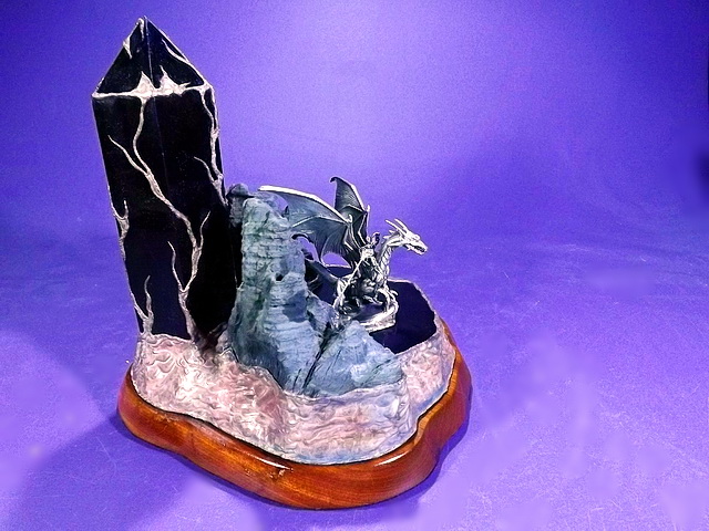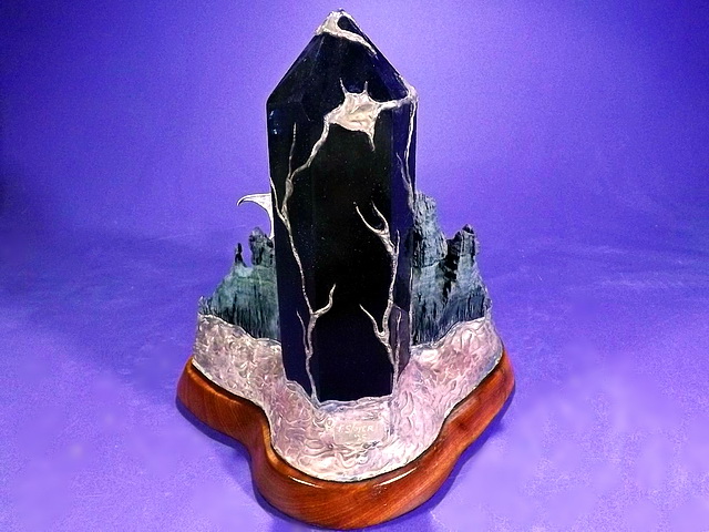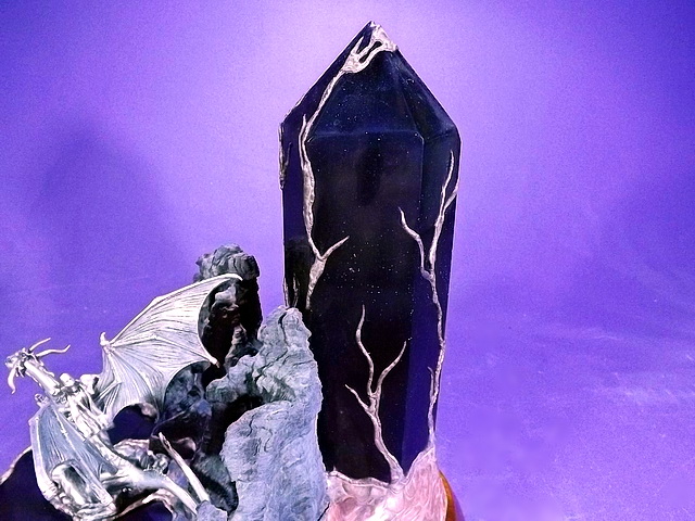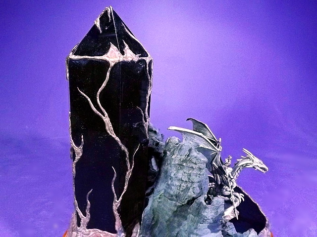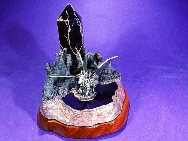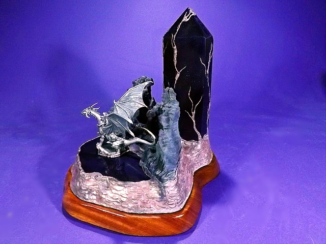 I’ve had these pieces for a long time and thought now is a good time to do something with them. The Fine Pewter Dragon and rider were created by Ral Partha, and the fantastic black mineral specimen is one of Mother Nature’s creations, from China. I made the point myself from an epoxy resin material. I have countless hours in making this point; first a mold, then hours of sanding and polishing. Then I did the “vine” work on its outside. But the overall finished piece was well worth the effort. Its sitting on a hand cut and finished slab of Corymbia Opaca, or Bloodwood, from Australia. The bottom is covered with heavy felt to protect furniture.
