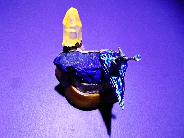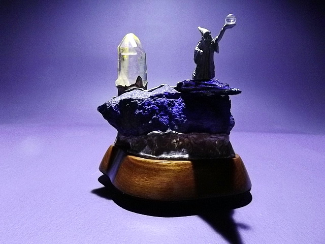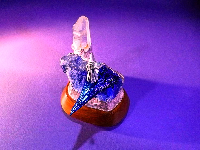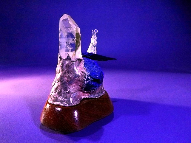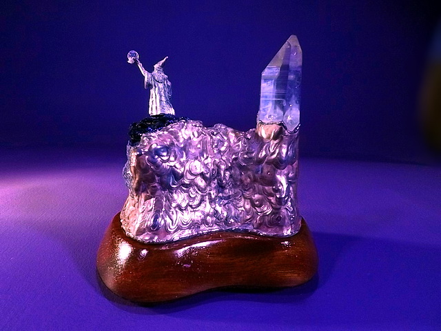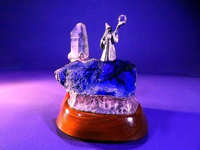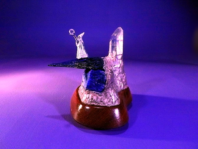 I’ve used a nice specimen of Azurite, to which I’ve added a small ‘Fan’ of Dichroic Kyanite, and a Brazilian Quartz Crystal to complete. I’ve installed a small, red, LED light under the Crystal, powered by a replaceable button battery. The Fine Pewter Wizard figure is by Perth Pewter. With so much color, this is a beautiful little piece. The base is of a hardwood, called Corymbia Opaca, or “Bloodwood”, from Australia. The bottom is felted to protect furniture.
